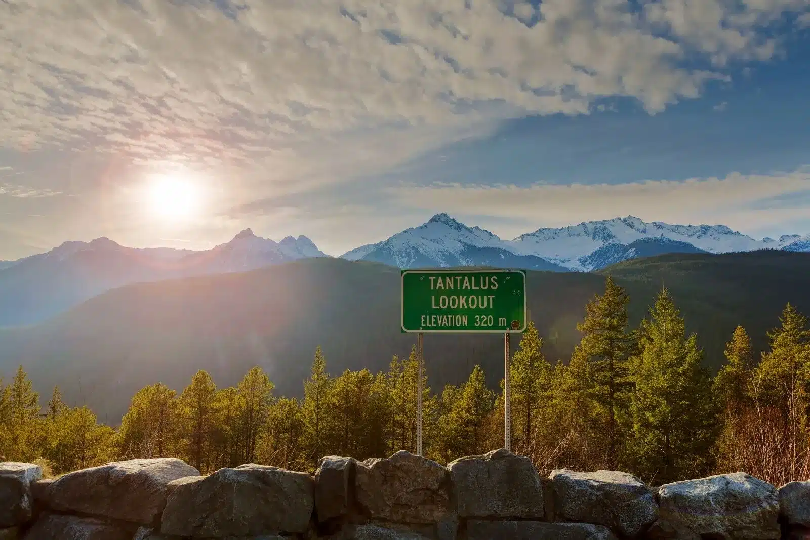 Photograph glacier-capped mountain peaks rising above Squamish Valley, One of the most iconic and scenic viewpoints along the highway.