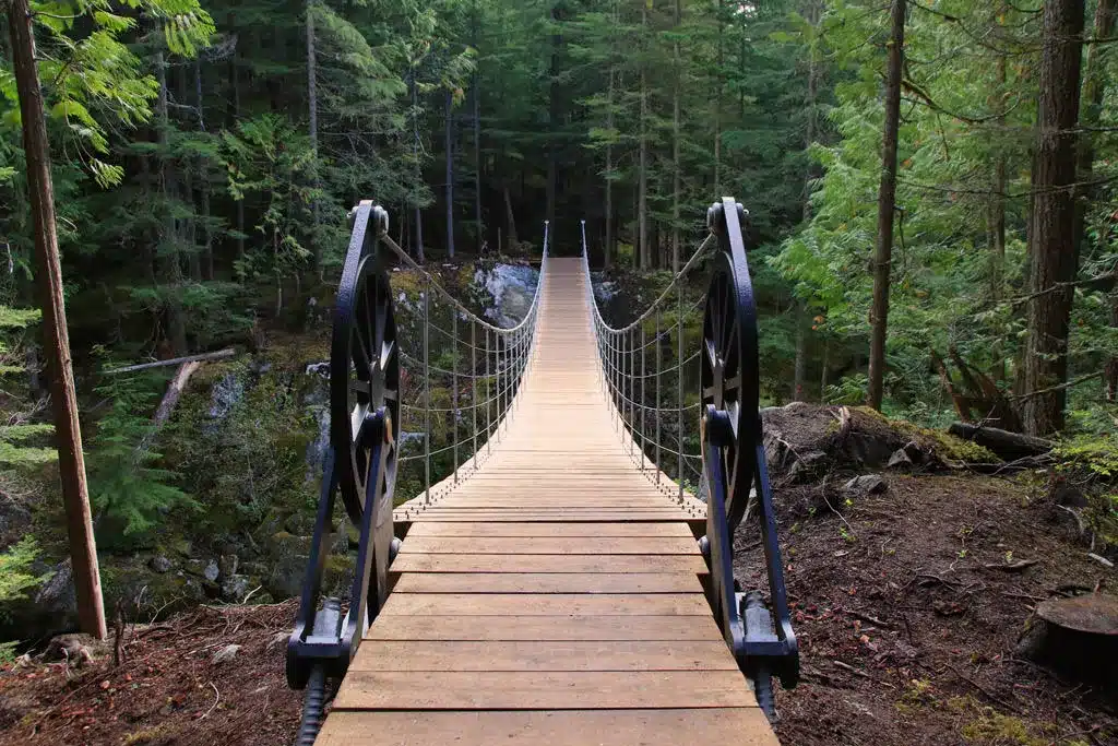 Discover colorful graffiti-covered rail cars hidden in the forest, connected by a suspension bridge, a unique and artistic stop near Whistler.
